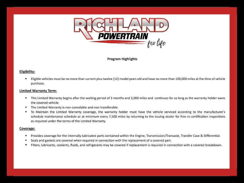 • Maintenance: First Visit: 12 Months/12,000 Miles